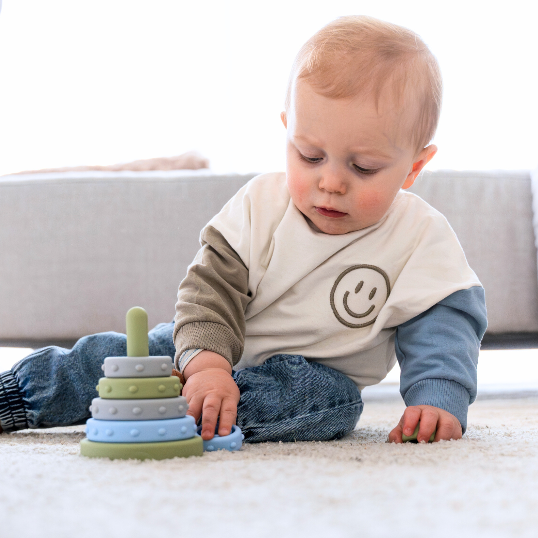 The silicone stacking tower combines safe play with a calming and educational design. Specially made for children aged 18 months and up, this toy offers a gentle, quiet experience that is perfect for both home and on the go.